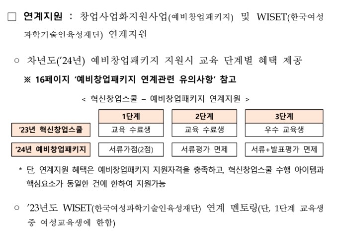 2023년 혁신창업스쿨 트랙은 총 3단계 교육내용으로 이루어지는데 1단계 및 2단계 교육 수료생은 차년 2024년 예비창업패키지 신청 시 1단계 수료자 서류가점(2점), 2단계 수료자 서류평가 면제권이 주어집니다. 3단계에서의 우수 교육생은 서류신청 및 발표평가 면제권이 부여됩니다. 이외 WISET(한국여성과학기술인육성재단) 연계 멘토링은 1단계 교육생 중 여성교육생에 한해 지원합니다.