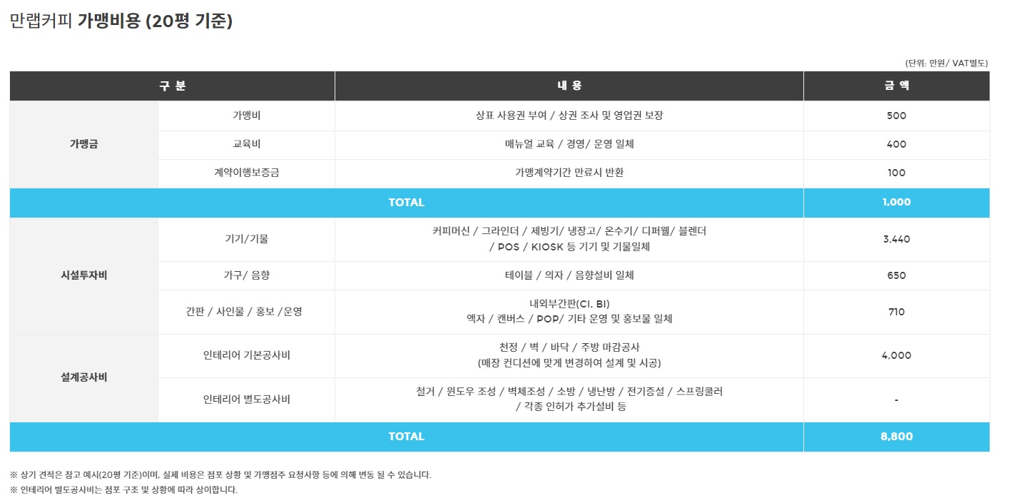 '만랩 커피' 공식 사이트에서도 가맹 비용을 확인할 수 있는데, 실제 비용은 점포 상황 및 가맹점주 요청사항 등에 의해 변동될 수 있으며, 인테리어 별도 공사비는 점포 구조 및 상황에 따라 상이할 수 있다.