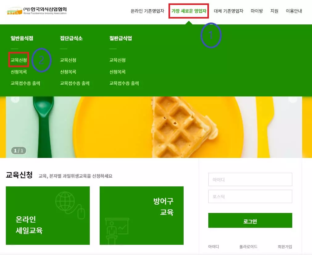 식품외생교육 전문, 온라인 위생교육 위생교육필증 온라인 발급 일반음식점 신규·기존영업자 식품위생교육 전문기관 한국외식산업협회.