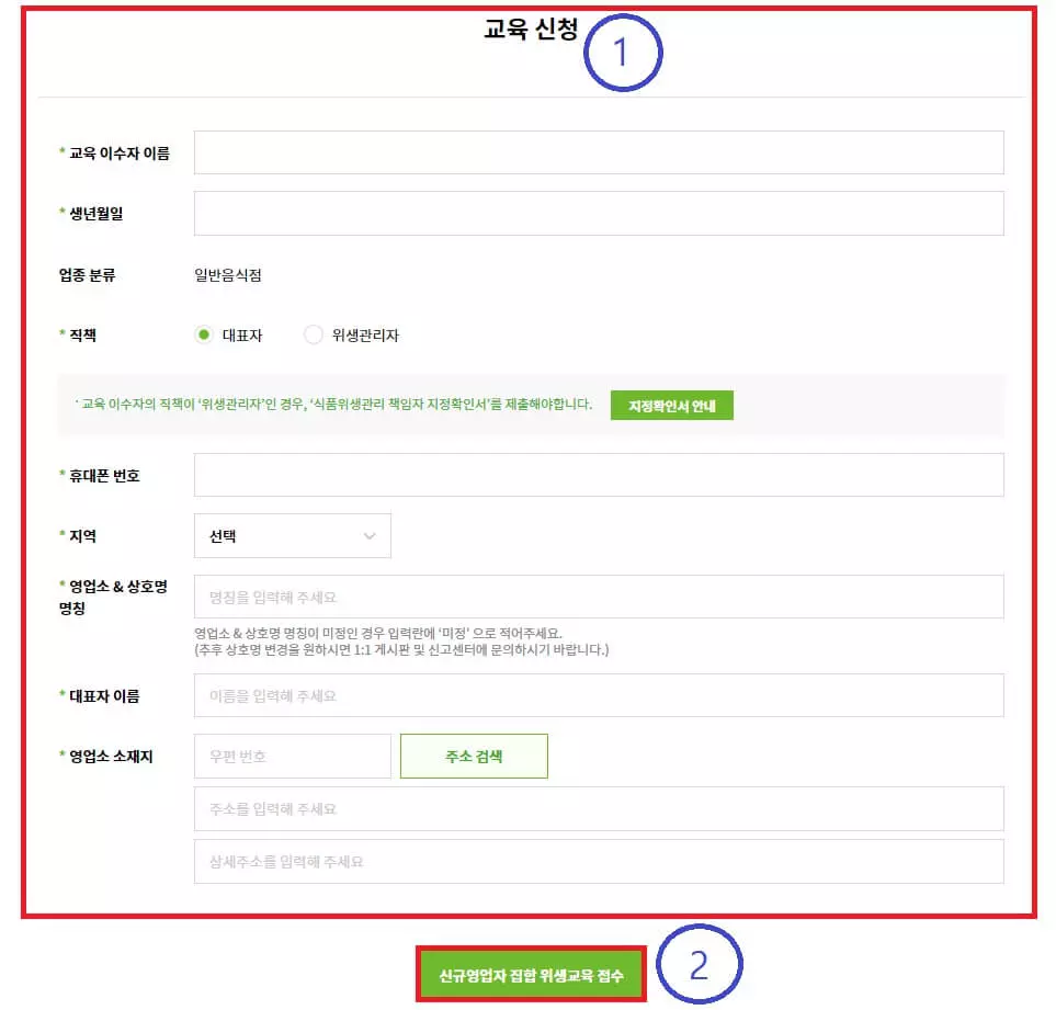 이렇게 신청한다면 각 지역별 교육 가능한 일정을 확인하여 본인의 시간을 맞춰 진행이 교육 수료가 가능하다. 원래는 위생교육이 온라인으로만 신규/기존 영업자가 교육 수료가 가능했지만 2022년 10월 1일 부로 집합 교육으로 변경이 되었다. 기존에 영업하는 자는 온라인으로 매년 받는 위생 교육 수료가 가능하다. 하지만 신규 영업자는 본인이 살고 있는 지역 또는 가까운 지역에 집합교육 일정을 확인하여 최초 1회 집합 교육을 시행하여야 한다. 이러한 점을 확인하여 본인에게 맞는 교육기관을 확인하여 위생교육을 접수하여 신청하길 바란다.